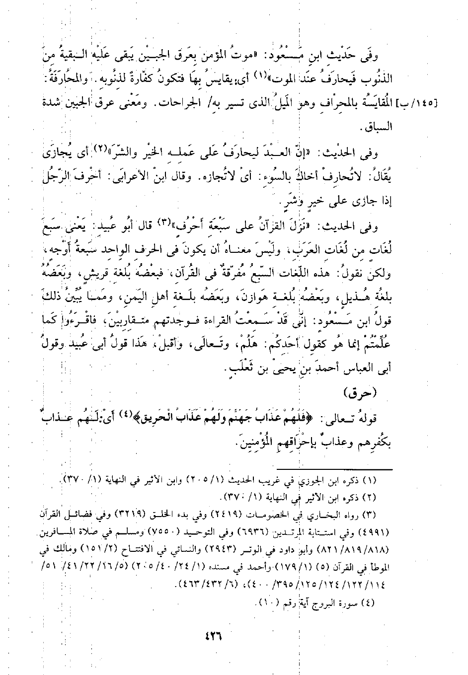 وفي الحديث: (نزل القرآن على سبعة أحرف) قال أبو عبيد: يعني سبع لغات من لغات العرب، وليس معناه أن يكون في الحرف الواحد سبعة أوجه، ولكن نقول: هذه اللغات السبع مفرقة في القرآن، فبعضه بلغة قريش، وبعضه بلغة هذيل، وبعضه بلغة هوازن، وبعضه بلغة أهل اليمن، ومما يبين ذلك قول ابن مسعود: إني قد سمعت القراءة فوجدتهم متقاربين، فاقرءوا كما علمتم إنما هو كقول أحدكم: هلم، وتعالى، وأقبل، هذا قول أبي عبيد وقول أبي العباس أحمد بن يحيى بن ثعلب.