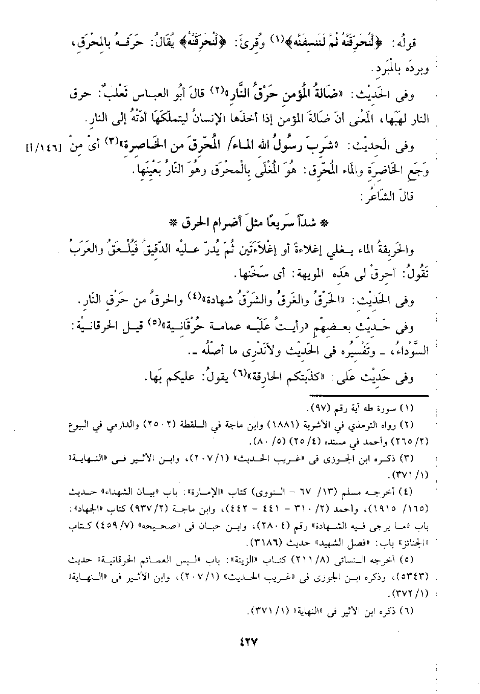 وفي الحديث: (ضالة المؤمن حرق النار) قال أبو العباس ثعلب: حرق النار لهبها، أن ضالة المؤمن إذا أخذها الإنسان ليتملكها أدته إلى النار.