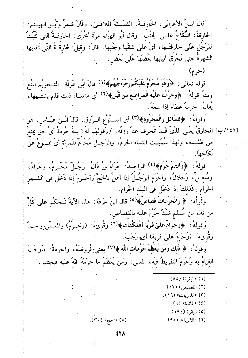 وقوله: {للسائل والمحروم} أي الممنوع الرزق. قال ابن عباس: هو [146/ ب] المحارق يعني الذي قد انحرف عنه رزقه./ وقولهم له: به حرمة أي حق يمنع من ظلمه، ولهذا سميت النساء الحرم، والرجل محرم للمرأة أي ممنوع عن نكاحها.