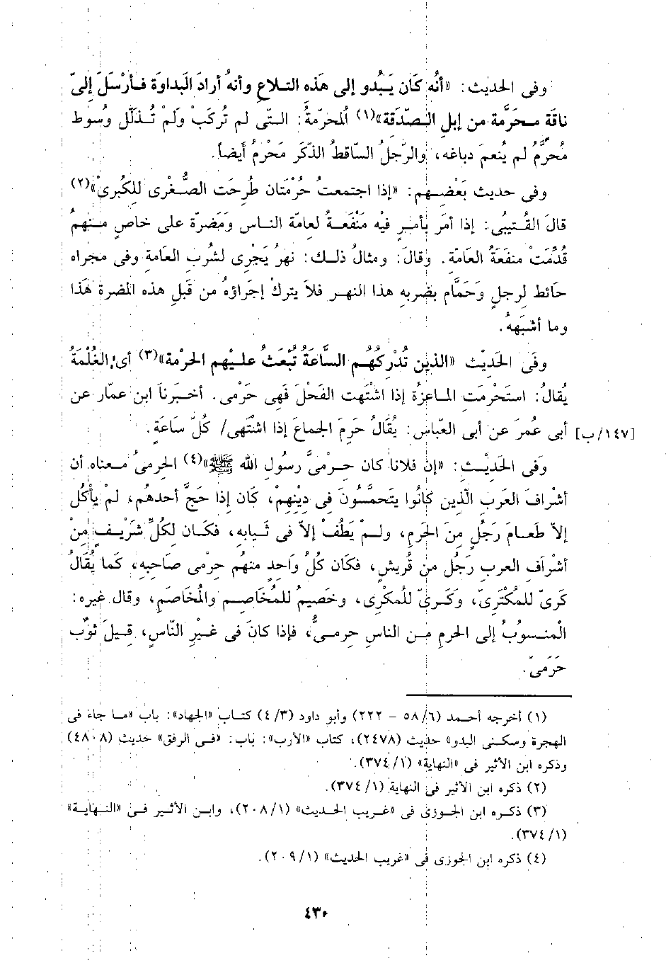 وفي الحديث: (إن فلانًا كان حرمي رسول الله - صلى الله عليه وسلم - الحرمى معناه أن أشراف العرب الذين كانوا يتحمسون في دينهم، كان إذا حج أحدهم، لم يأكل إلا طعام رجل من الحرم، ولم يطف إلا في ثيابه، فكان لكل شريف من أشراف العرب رجل من قريش، فكان كل واحد منهم حرمى صاحبه، كما يقال كري للمكتري، وكري للمكري، وخصيم للمخاصم والمخاصم، وقال غيره: المنسوب إلى الحرم من الناس حرمى، فإذا كان في غير الناس، قيل ثوب حرمى.