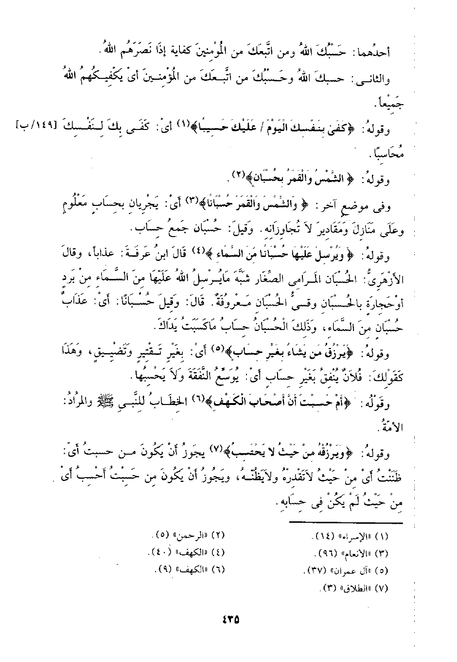 وفي موضع آخر: {والشمس والقمر حسبانًا} أي: يجريان بحساب معلوم وعلى منازل ومقادير لا تجاوزانه. وقيل: حسبان جمع حساب.