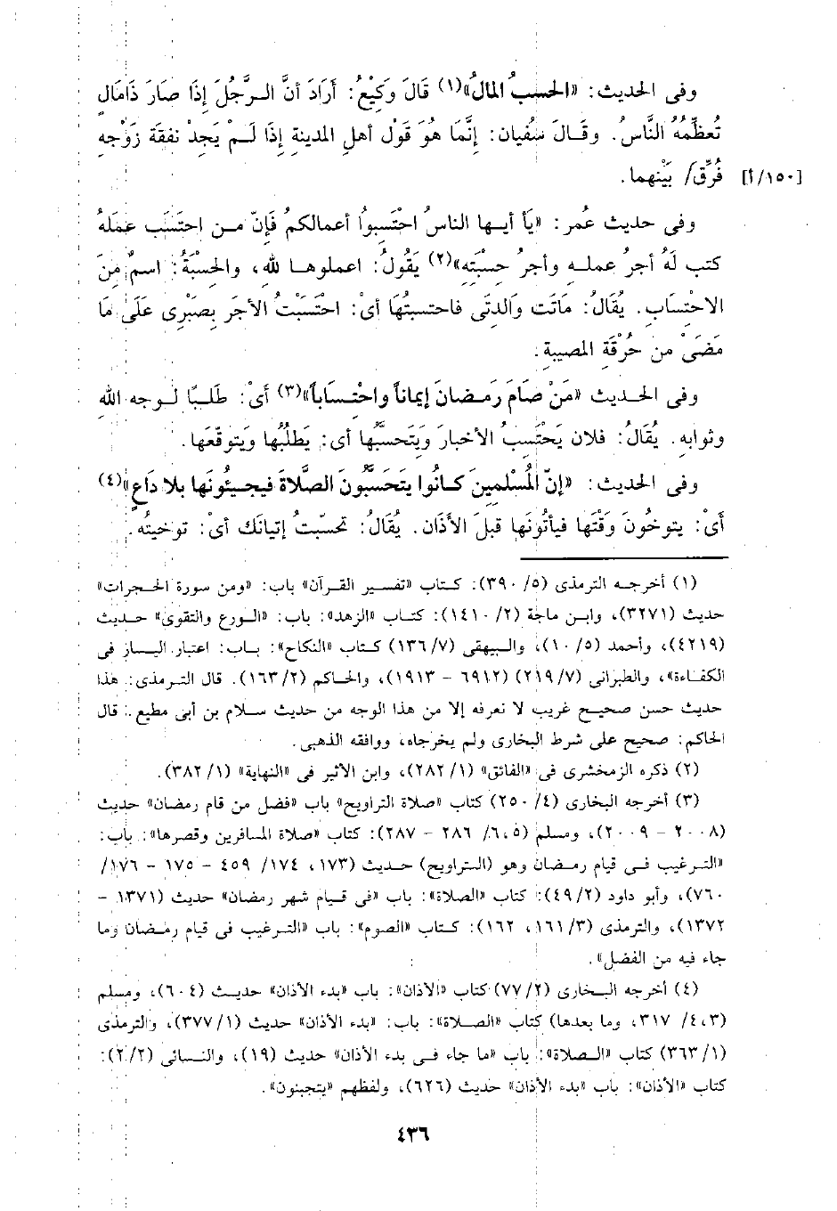 وفي الحديث: (من صام رمضان إيمانًا واحتسابصا (أي: طلبًا لوجه الله وثوابه. يقال: فلان يحتسب الأخبار ويحتسبها أي: يطلبها ويتوقعها.