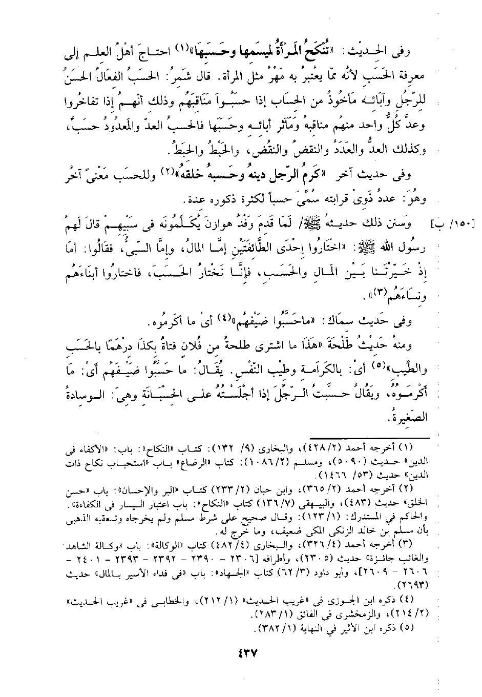 وفي الحديث: (تنكح المراة لميسمهاوحسبها) احتاج أهل العلم إلى معرفة الحسب لأنه مما يعتبر به مهر مثل المراة. قال شمر: الحسب الفعال الحسن للرجل وآبائه مأخوذ من الحساب إذا حسبوا مناقبهم وذلك أنهم إذا تفاخروا وعد كل واحد منهم مناقبه ومآثر أبائه وحسبها فالحسب العد والمعدود حسب، وكذلك العد والعدد والنقض والنقض، والحبط والحبط.