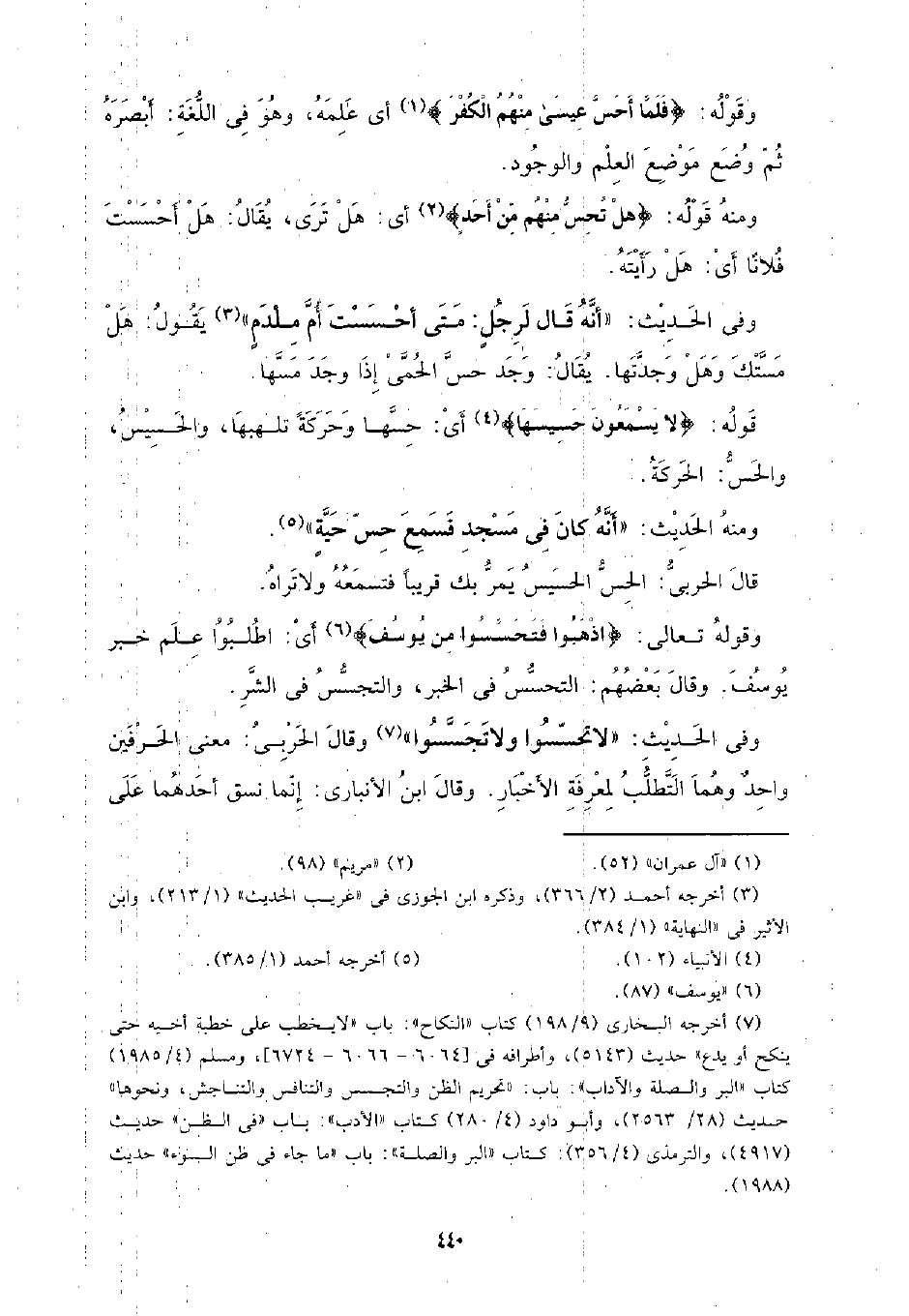 وفي الحديث: (لا تحسسوا ولا تجسسوا) وقال الحربي: معنى الحرفين واحد وهما التطلب لمعرفة الأخبار. وقال ابن الأنباري: إنما نسق أحدهما على