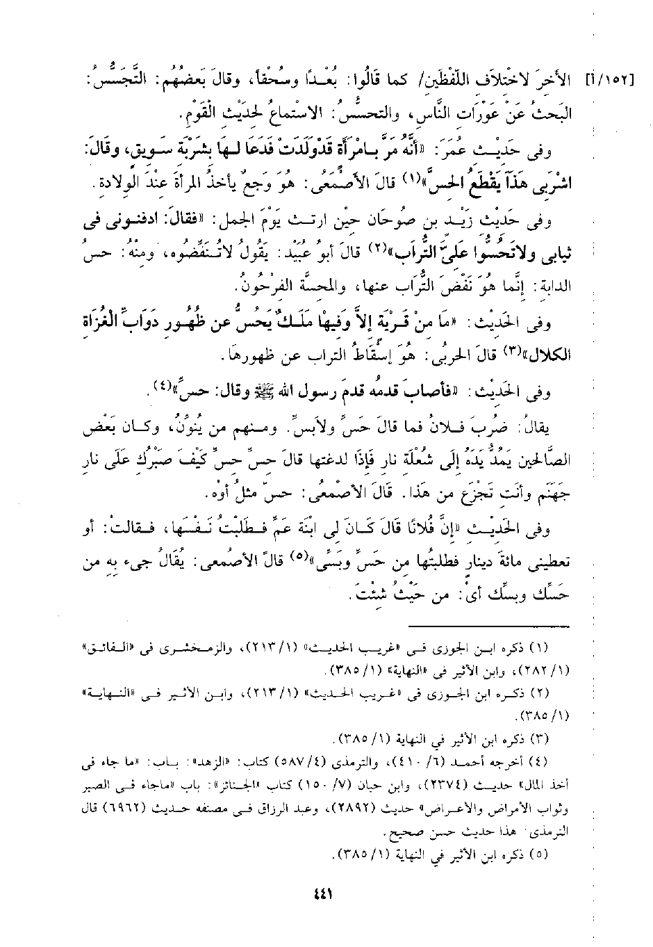 وفي حديث زيد بن صوحان حين ارتث يوم الجمل: (فقال: ادفنوني في ثيابي ولا تحسوا علي التراب) قال أبو عبيد: يقول لا تنفضوه، ومنه: حس الدابة: إنما هو نفض التراب عنها، والمحسة الفرحون.