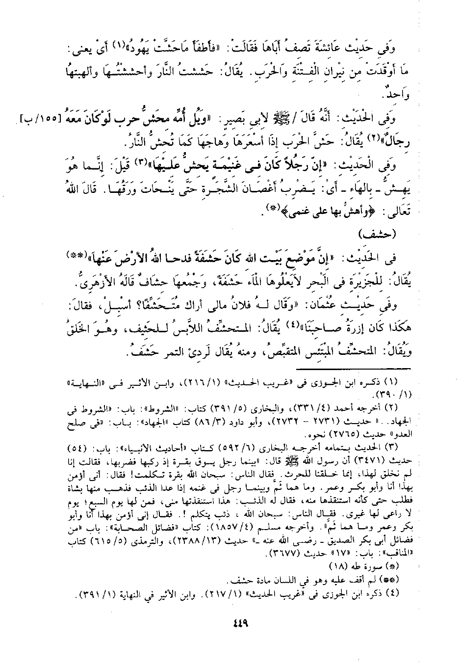 وفي حديث عائشة تصف أباها فقالت: (فأطفأ ما حشت يهود) أي يعني: ما أوقدت من نيران الفتنة والحرب - يقال: حششت النار وأحششتها وألهبتها واحد.