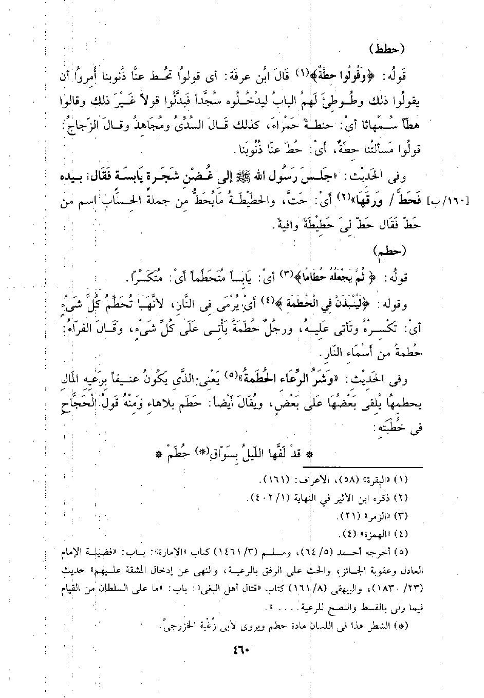 وفي الحديث: (وشر الرعاء الحطمة) يعني: الذي يكون عنيفًا برعيه المال يحطمها يلقي بعضها على بعض، ويقال أيضًا: حطم بلاهاء ومنه قول الحجاج في خطبته: