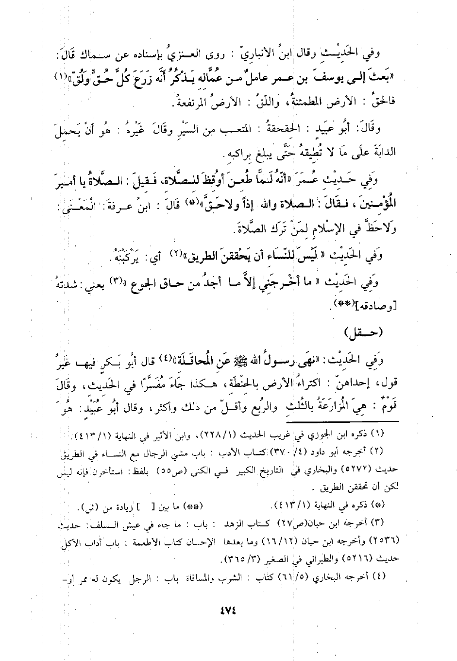 وفي الحديث: (نهى رسول الله - صلى الله عليه وسلم - عن المحاقلة) قال أبو بكر فيها غير قول، إحداهن: اكتراء الأرض بالحنطة، هكذا جاء مفسرًا في الحديث، وقال قوم: هي المزارعة بالثلث والربع وأقل من ذلك وأكثر، وقال أبو عبيد: هو