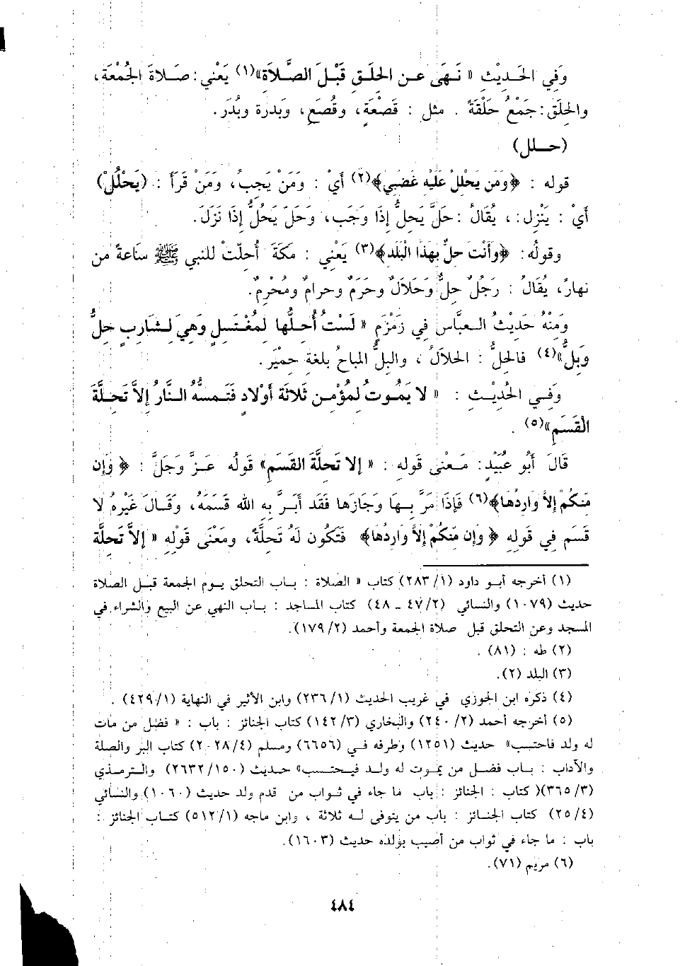 وفي الحديث (نهى عن الحلق قبل الصلاة) يعني: صلاة الجمعة، والحلق: جمع حلقة. مثل قصعة، وقصع، وبدرة وبدر.