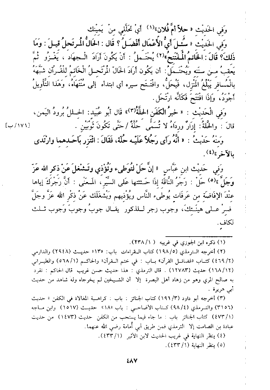 وفي الحديث: (خير الكفن الحلة) قال أبو عبيد: الحلل برود اليمن، قال: والحلة: إزار ورداء لا تسمى حلة/ حتى تكون ثوبين. [171/ ب]