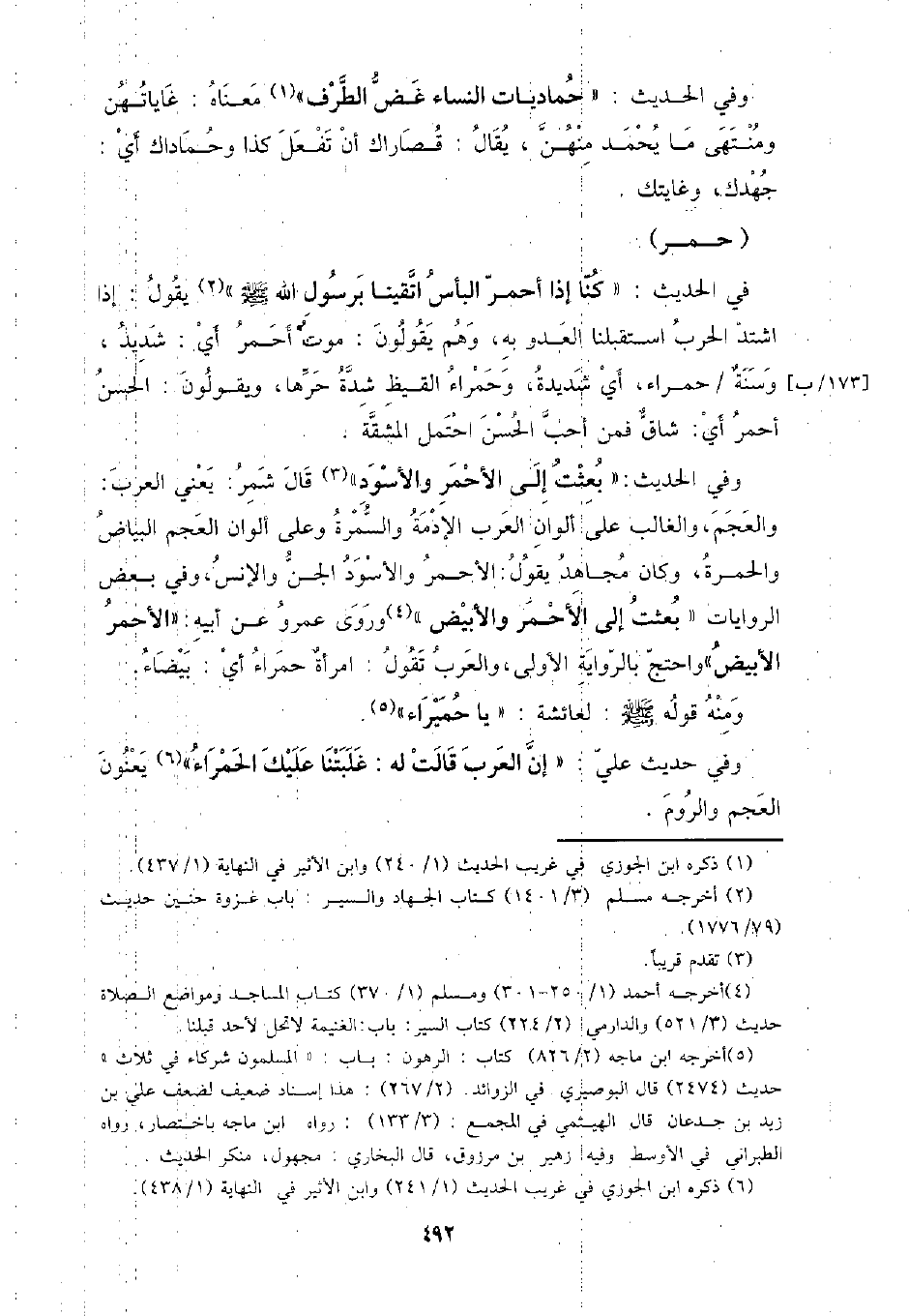 وفي الحديث: (بعثت إلى الأحمر والأسود) قال شمر: يعني العرب: والعجم، والغالب على ألوان العرب الأدمة والسمرة وعلى ألوان العجم البياض والحمرة، وكان مجاهد يقول: الأحمر والأسود الجن والإنس، وفي بعض الروايات (بعثت إلى الأحمر والأبيض) وروى عمرو عن أبيه: (الأحمر الأبيض) واحتج بالرواية الأولى، والعرب تقول: امرأة حمراء أي: بيضاء. ومنه قوله - صلى الله عليه وسلم -: لعائشة: (يا حميراء).