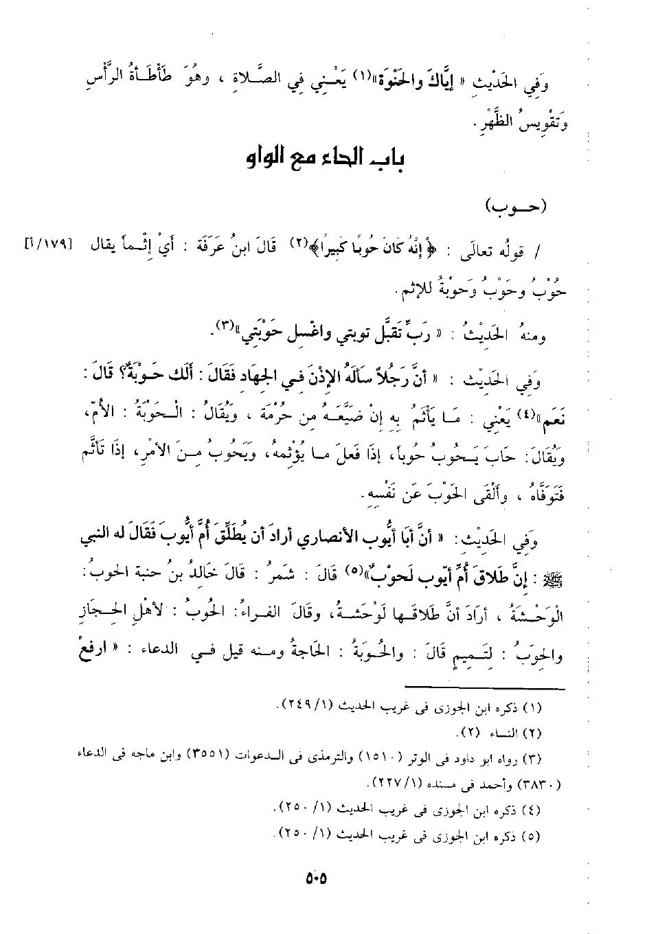 وفي الحديث: (أن آبا أيوب الأنصاري أراد أن يطلق أم أيوب فقال له النبي - صلى الله عليه وسلم -: : إن طلاق أم أيوب لحبوب) قال: شمر: قال خالد بن حنبلة الحوب: الوحشة، أراد أن طلاقها لوحشة، وقال القراء: الحوب: لأهل الحجاز والحوب: لتميم قال: والحوبة: الحاجة ومنه قيل في الدعاء: (ارفع