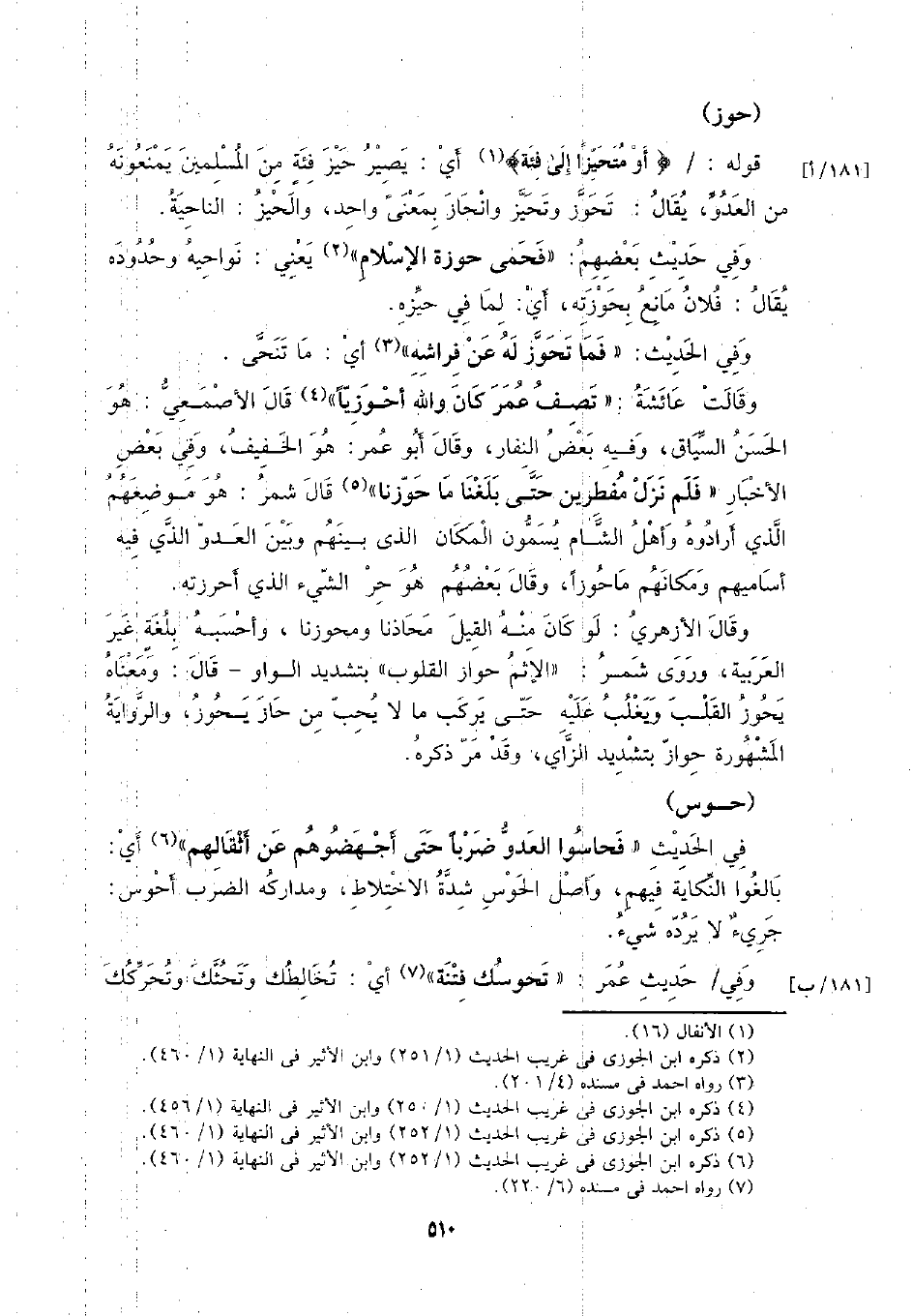 وفي حديث بعضهم: (فحمى حوزة الإسلام) يعني: نواحيه وحدوده يقال: فلان مانع بحوزته، أي: لما في حيزه.