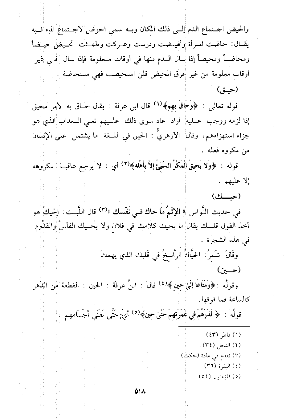 والحيض اجتماع الدم إلى ذلك المكان وبه سمى الحوض لاجتماع الماء فيه يقال: حاضت المرأة وتحيضت ودرست وعركت وطمست تحيض حيضًا ومخاضا ومحيضًا إذا سال الدم منها في أوقات معلومة فإذا سال في غير أوقات معلومة من غير عرق المحيض قلن استحيضت فهي مستحاضة.