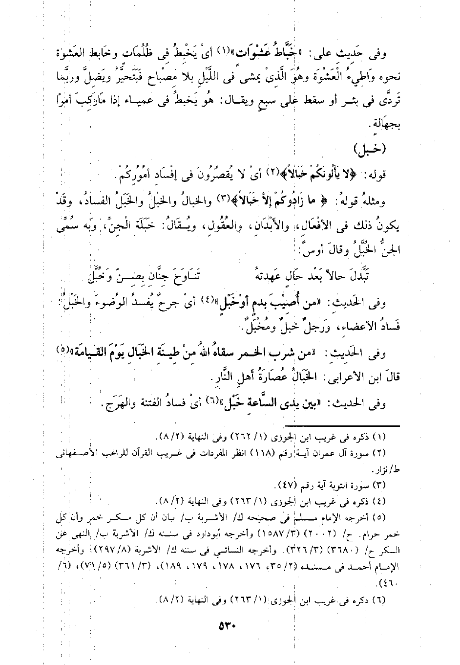 وفي حديث علي: (خباط عشوات) أي يخبط في ظلمات وخابط العشوة نحوه واطئ العشوة وهو الذي يمشي في الليل بلا مصباح فيتحير ويضل وربما تردى في بئر أو سقط على سبع ويقال: هو يخبط في عمياء إذا ما ركب أمرًا بجهالة.