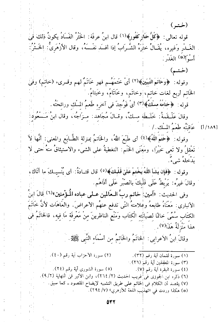 وفي الحديث: (آمين: خاتم رب العالمين على عباده المؤمنين) قال ابن الأنباري: معناه طابعه وعلامته التي تدفع عنهم الأعراض. والعاهات لأن خاتم الكتاب سمى خاتمًا لصيانته الكتاب ومنع الناظرين ن معرفة ما فيه، فالخاتم في هذا منزلة هذا.