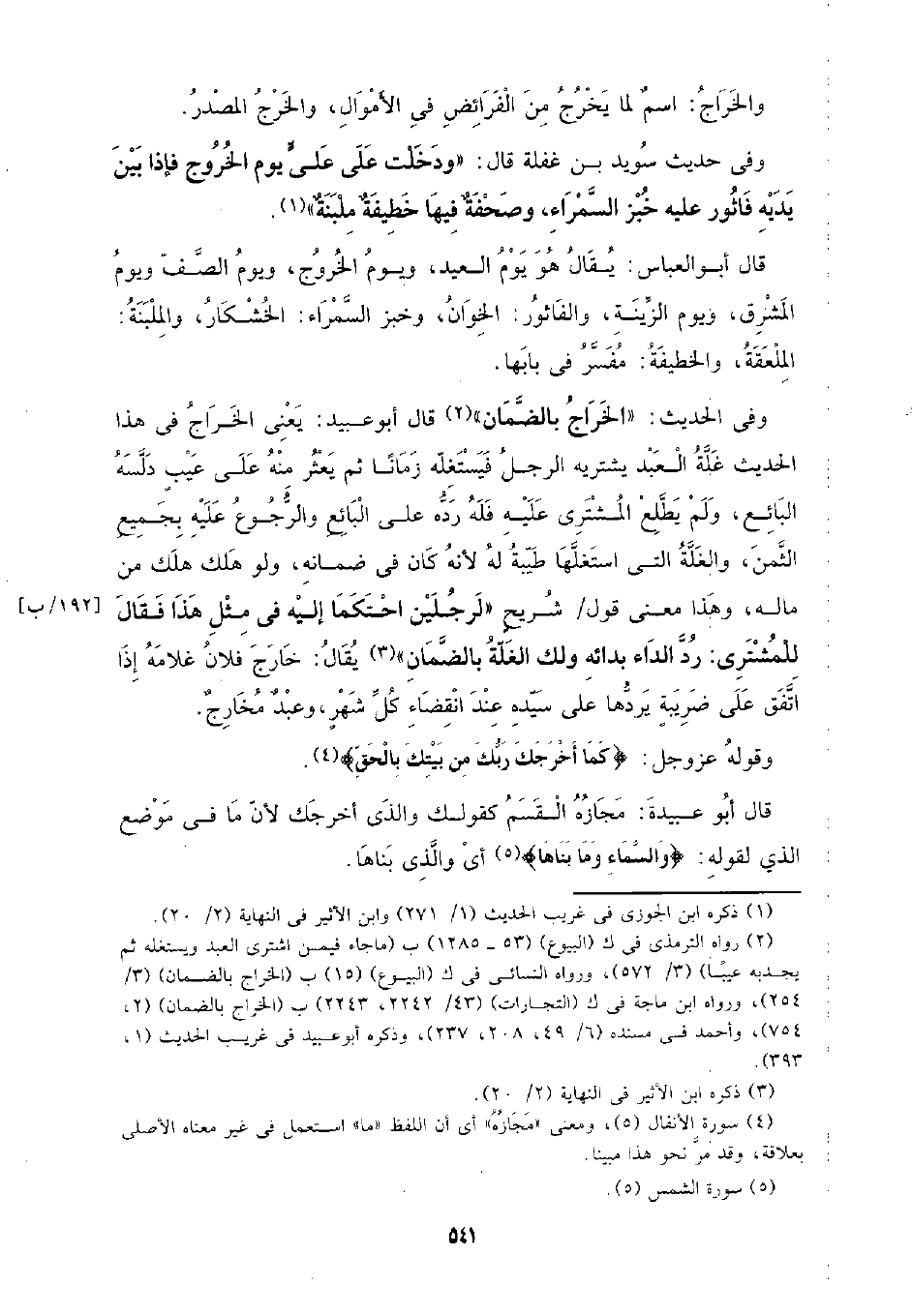 وفي الحديث: (الخراج بالضمان) قال أبو عبيد: يعني الخراج في هذا الحديث غلة العبد يشتريه الرجل فيستغله زمانًا ثم يعثر منه على عيب دلسه البائع، ولم يطلع المشتري عليه فله رده على البائع والرجوع عليه بجميع الثمن، والغلة التي استغلها طيبة له لأنه كان في ضمانه، ولو هلك هلك من ماله، وهذا معنى القول/ شريح (لرجلين احتكما إليه في مثل هذا فقال [92/ ب] للمشتري: رد الداء بدائه ولك الغلة بالضمان) يقال: خارج فلان غلامه إذا اتفق على ضريبة يردها على سيده عند انقضاء كل شهر، وعبد مخارج.