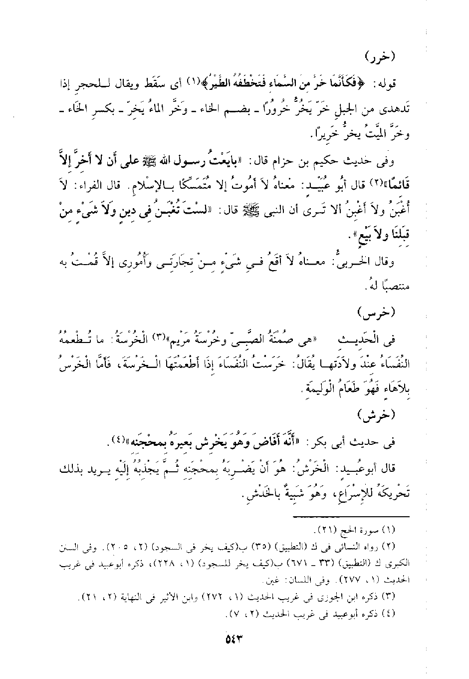 وفي حديث حكيم بن حزام قال: (بايعت رسول - صلى الله عليه وسلم - على أن لا أخر إلا قائمًا) قال ألو عبيد: معناه لا أموت إلا متمسكا بالإسلام. قال الفراء: لا أغبن ولا أغبن ألا ترى أن النبي - صلى الله عليه وسلم - قال: (لست تغبن في دين لا شيء من قبلنا ولا بيع).