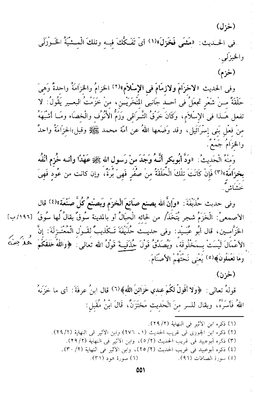 وفي حديث حذيفة: (وإن الله يصنع صانع الخزم ويصنع كل صنعة) قال الأصمعي: الخزم شجر يتخذ من لحائه الحبال أو بالمدينة سوق يقال لها سوق [196/ ب] الخزاميين، قال أبو عبيد: وفي حديث حذيفة قول الله تعالى: {والله خلقكم وما تعملون} يعني نحتهم الأصنام.