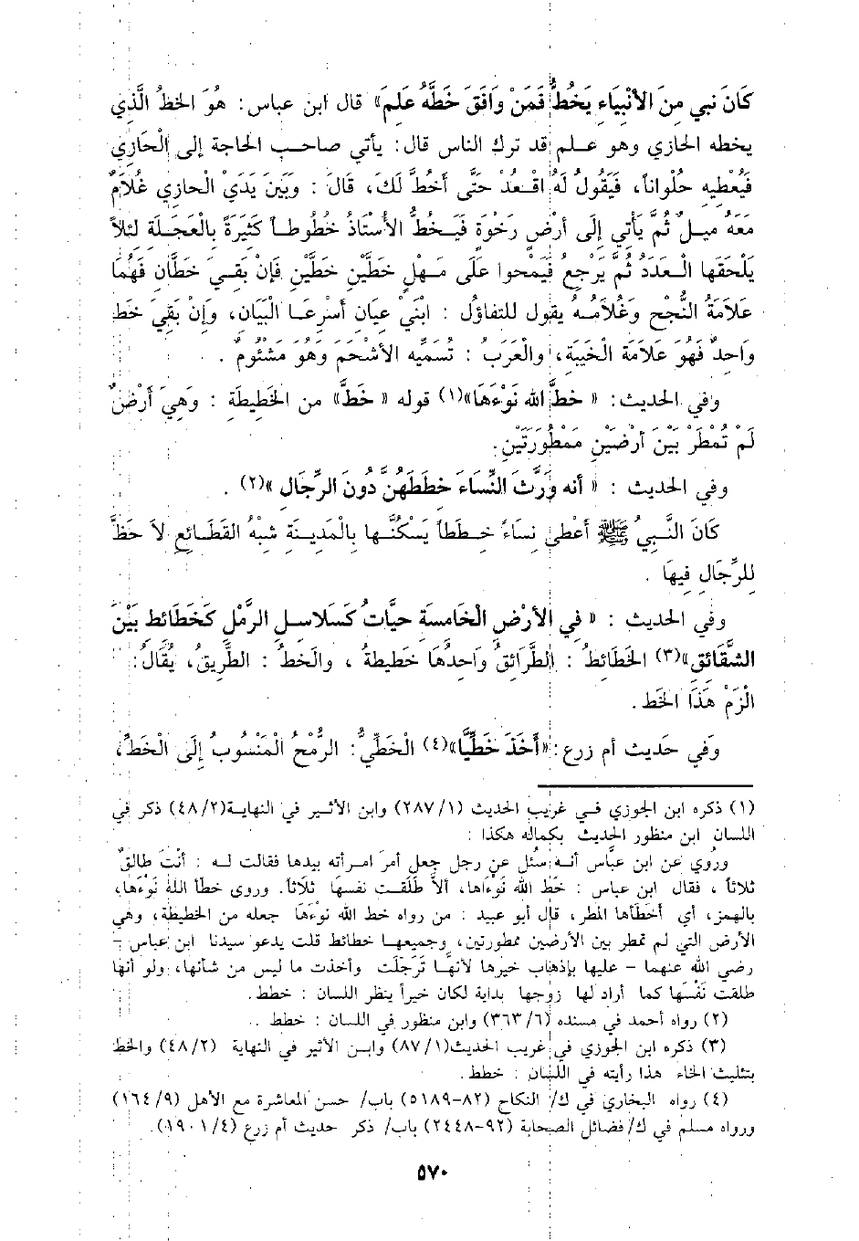 كان نبي من الأنبياء يخط فمن وافق خطه علم) قال ابن العباس: هو الخط الذي يخطه الحازي وهو علم قد ترك الناس قال: يأتي صاحب الحاجة إلي الحازي فيعطيه حلوانا، فيقول له اقعد حتى أخط لك، قال: وبين يدي الحازي غلام معه ميل ثم يأتي إلي أرض رخوة فيخط الأستاذ خطوطا كثيرة بالعجلة لئلا يلحقها العدد ثم يرجع فيمحوا علي مهل خطين خطين فإن بقي خطان فهما علامة النجح وغلامه يقول للتفاؤل: ابني عيان أسرعا البيان، وإن بقي خط واحد فهو علامة الخيبة، والعرب: تسميه الأشحم وهو مشئوم.