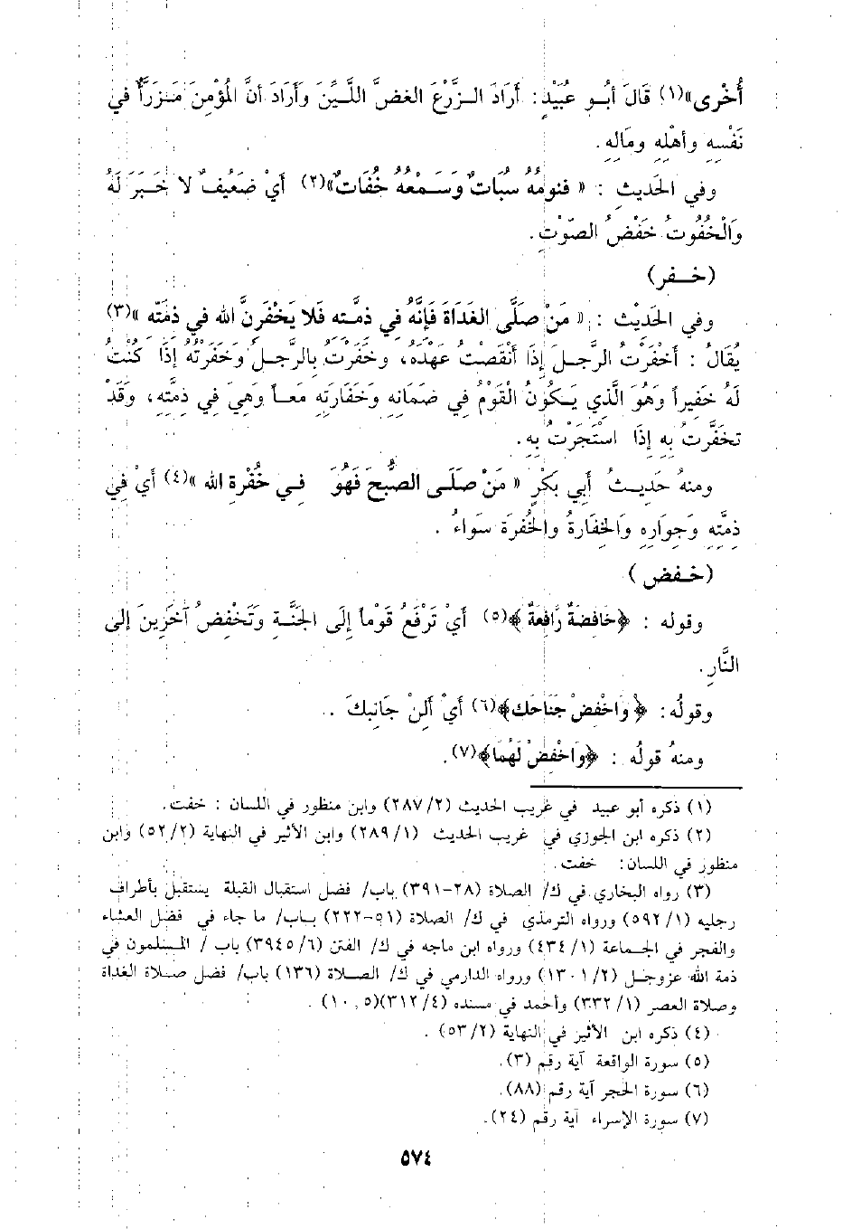 وفي الحديث: (من صلي الغداة فإنه في ذمته فلا يخفرن الله في ذمته) يقال: أخفرت الرجل إذا أنقصت عهده، وخفرت بالرجل وخفرته إذا كنت له خفيرًا وهو الذي يكون القوم في ضمانه وخفارته معًا وهي في ذمته، وقد تخفرت به إذا استجرت به.