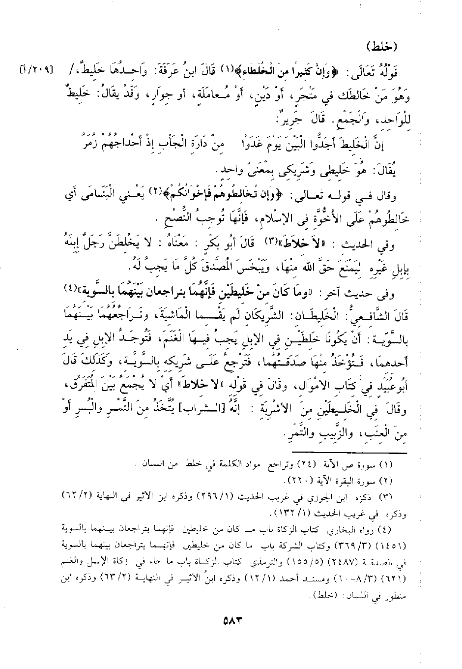 قال الشافعي: الخليطان: الشريكان لم يقسما الماشية، وتراجعهما بينهما بالسوية: أن يكونا خليطين في الإبل يجب فيها الغنم، فتوجد الغنم في يد أحدهما، فتؤخذ منها صدقتهما، فترجع علي شريكة بالسوية، وكذلك قال أبو عبيد في كتاب الأموال، وقال في قوله (لا خلاط) أي لا يجمع بين المتفرق، وقال في الخليطين من الأشربة: إنه [الشراب] يتخذ من التمر والبسر أو من العنبن والزبيب والتمر.