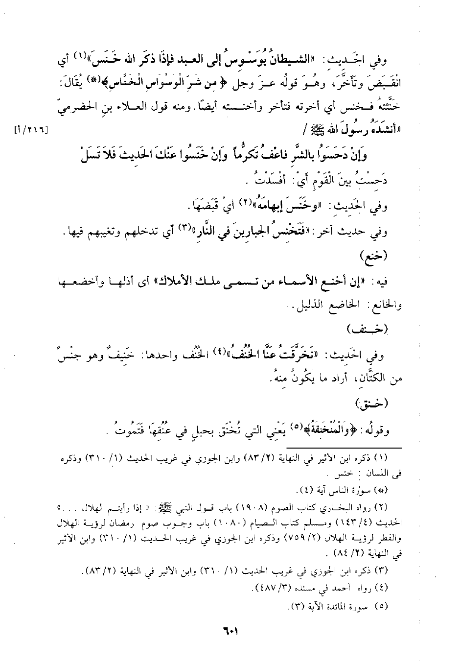 وفي الحديث: (الشيطان يوسوس إلى العبد فإذا ذكر الله خنس) أي انقبض وتأخر، وهو قوله عز وجل: {من شر الوسواس الخناس} يقال: خنثه فخنس أي أخرته فتأخر وأخنسته أيضًا. ومنه قول العلاء بن الحضرمي (أنشده رسول الله - صلى الله عليه وسلم - / [216/ أ]