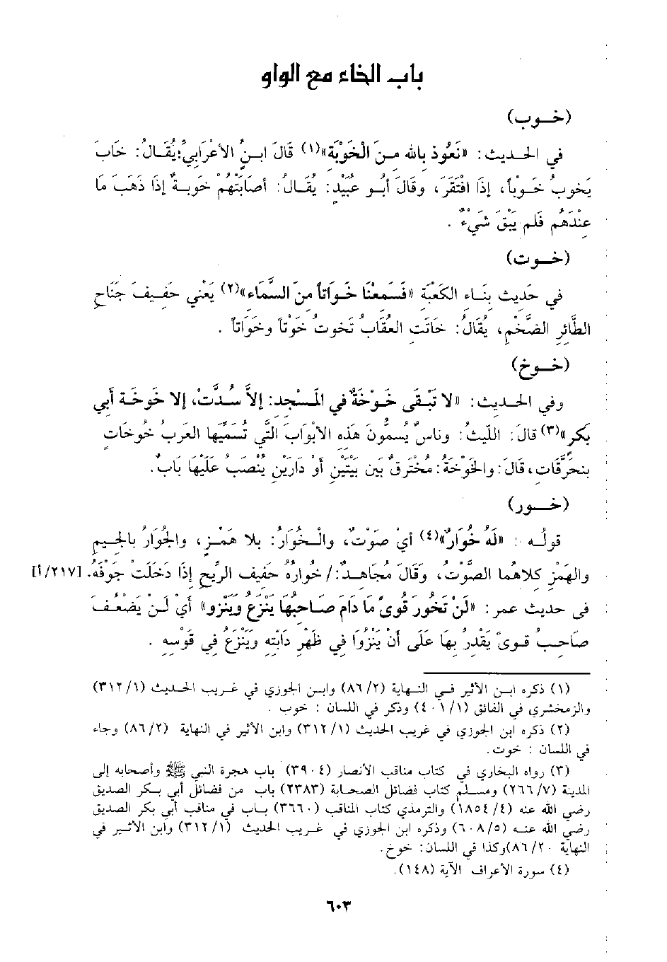 وفي الحديث: (لا تبقى خوخة في المسجد: إلا سدت، إلا خوخة أبي بكر) قال: الليث: وناس يسمون هذه الأبواب التي تسميها العرب خوخات بنحرقات، قال: والخوخة: مخترق بين بيتين أو دارين ينصب عليها باب.
