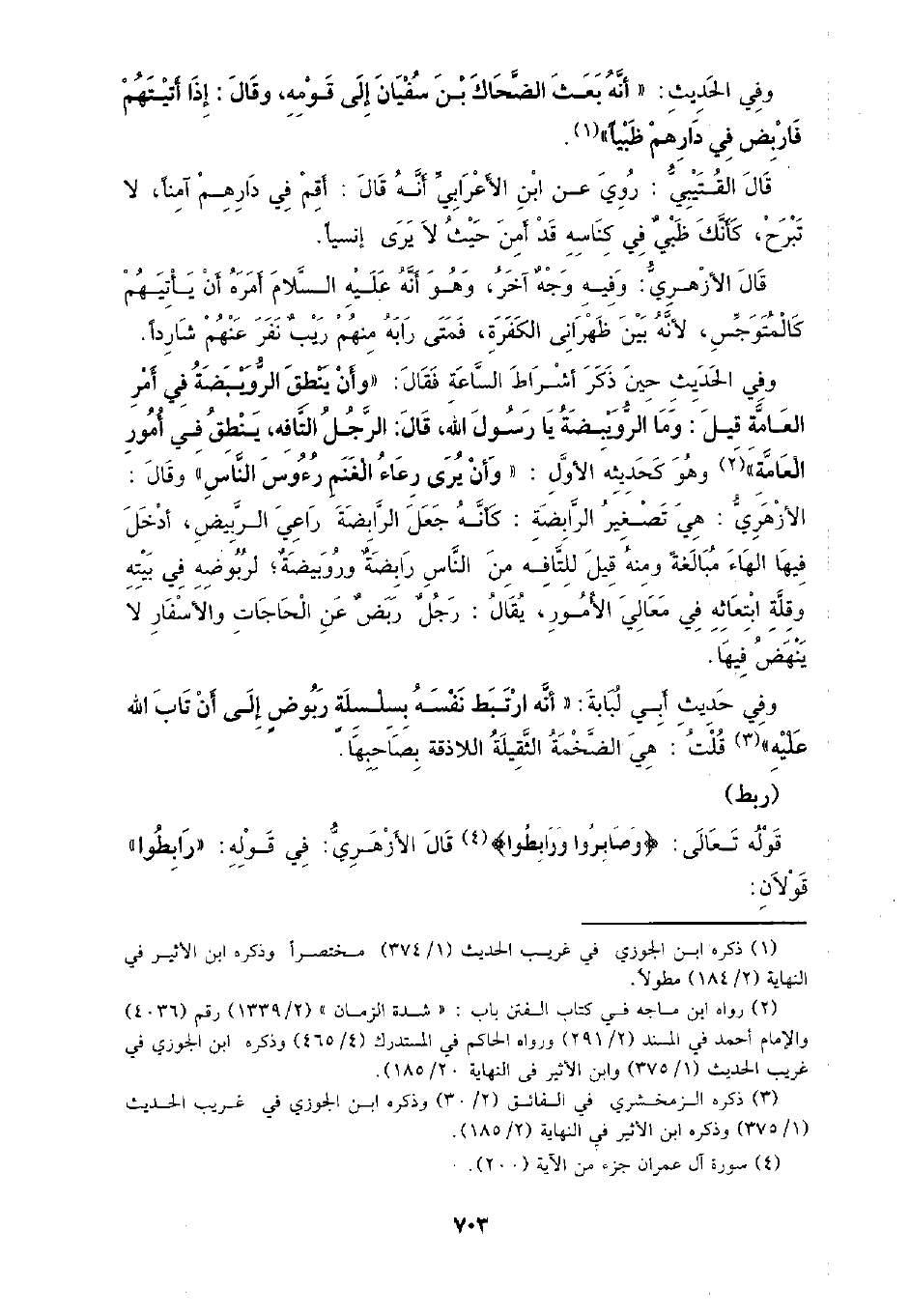وفي الحديث حين ذكر أشراط الساعة فقال: (وأن ينطق الرويبضة في أمر العامة قيل: وما الروبيضة يا رسول الله، قال: الرجل التافه، ينطق في أمور العامة) وهو كحديثه الأول: (وأن ير رعاء الغنم رءوس الناس) وقال: الأزهري: هي تصغير الرابضة: كأنه جعل الرابضة، راعي الربيض، أدخل فيها الهاء مبالغة ومنه قيل للتافه من الناس رابضة وروبيضة، لربوضه في بيته وقلة ابتعاثه في معالي الأمور، يقال: رجل ربض عن الحاجات والأسفار لا ينهض فيها.