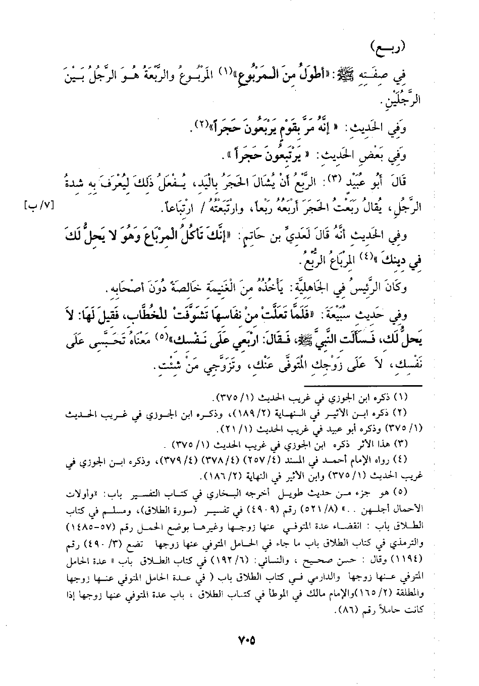 وفي حديث سبيعة: (فلما تعلت من نفاسها تشوفت للخطاب، فقيل لها: لا يحل لك، فسألت النبي - صلى الله عليه وسلم -، فقال: اربعي على نفسك) معناه تحسبي على نفسك، لا على زوجك المتوفى عنك، وتزوجي من شئت.