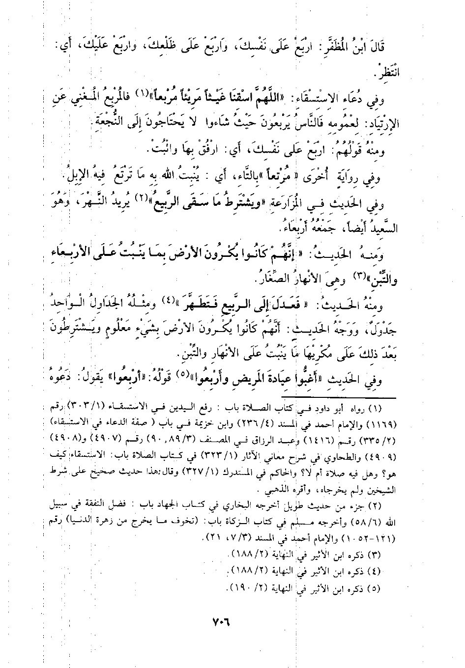 وفي دعاء الاستقساء: (اللهم اسقنا غيثا مريئا مربعا) فالمربع المغني عن الإرتياد: لعمومه فالناس يربعون حيث شاءوا لا يحتاجون إلى النجعة.