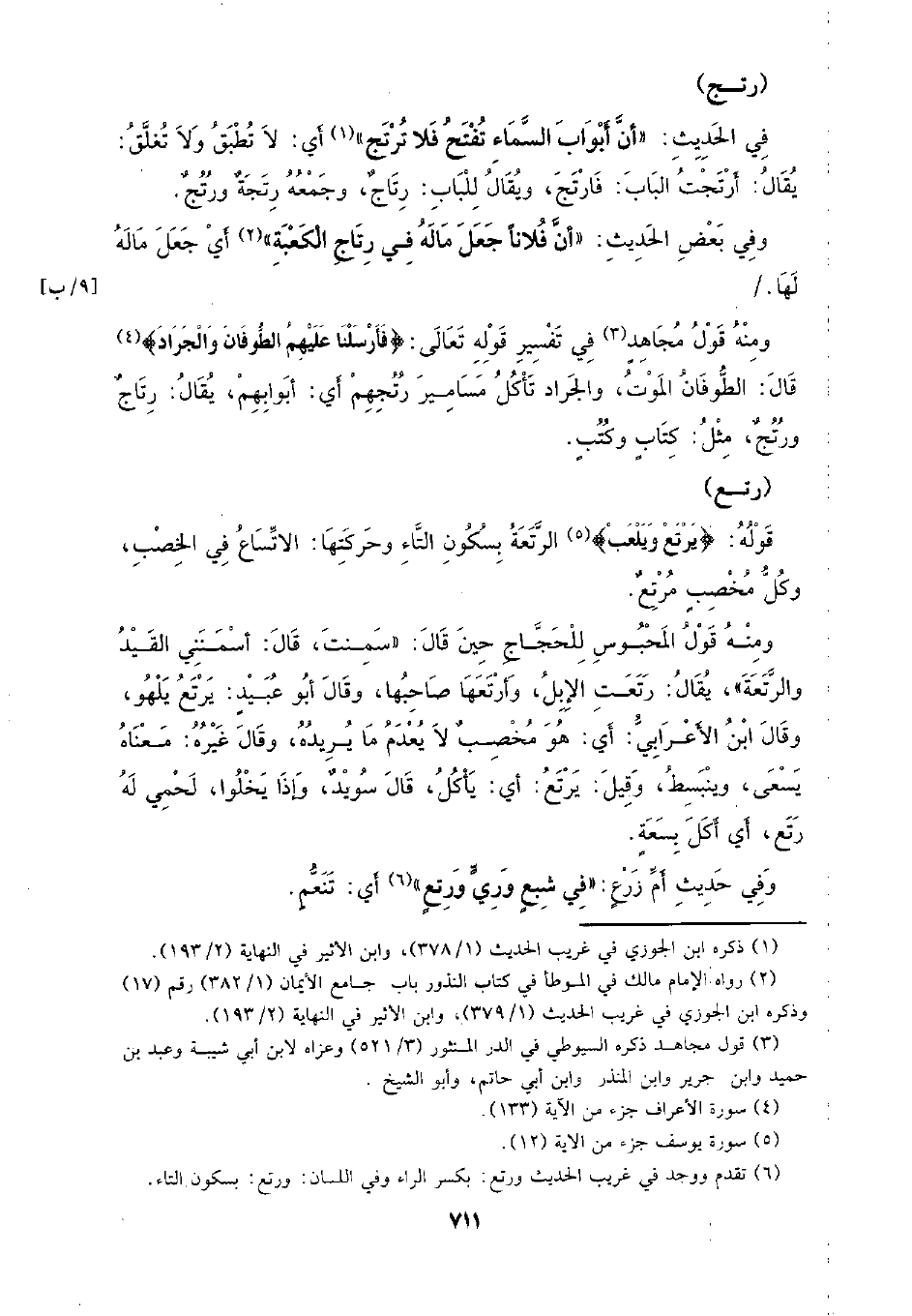ومن قول مجاهد في تفسير قوله تعالى: {فَأَرْسَلْنَا عَلَيْهِمُ الطُّوفَانَ وَالْجَرَادَ} قال: الطوفات الموت، والجراد تأكل مسامير رتجهم أي: أبوابهم، يقال: رتاج ورتج، مثل: كتاب وكتب.