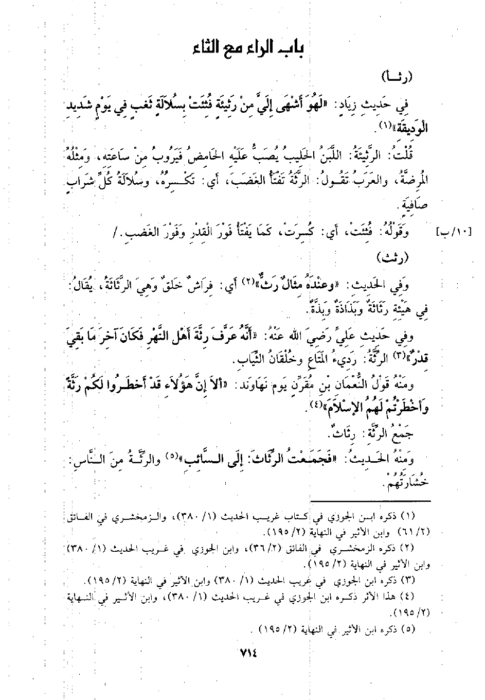 وفي حديث علي رضي الله عنه: (أنه عرف رثة أهل النهر فكان آخر ما بقي قدر) الرثة: رديء المتاع وخلقان الثياب.