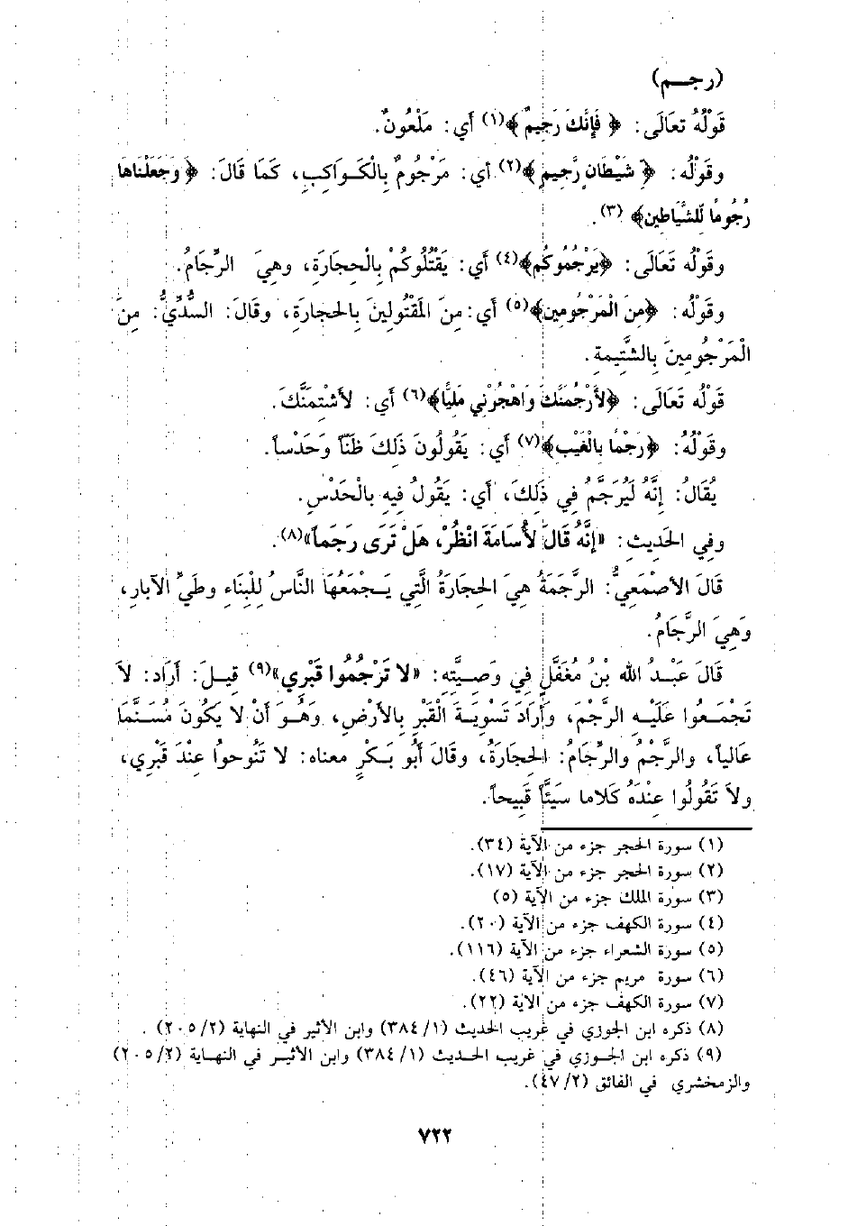 قال عبد الله بن مغفل في وصيته: (لا ترجموا قبري) قيل: أراد: لا تجمعوا عليه الرجم، وأراد تسوية القبر بالأرض، وهو أن لا يكون مسنما عاليا، والرجم والرجام: الحجارة، وقال أبو بكر معناه: لا تنوحوا عند قبري، ولا تقولوا عنده كلاما سيئا قبيحا.