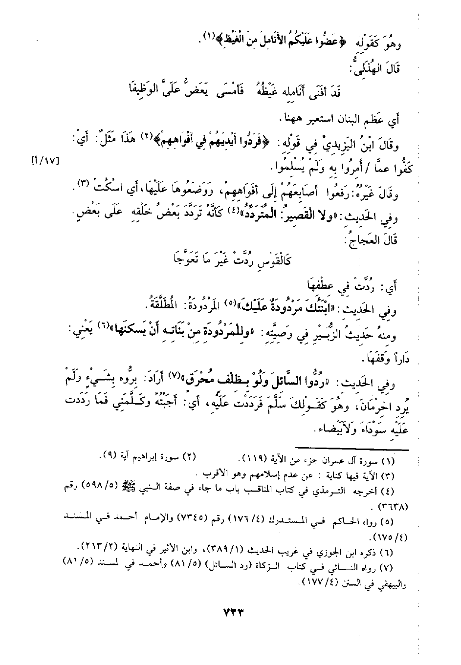 وفي الحديث: (ردوا السائل ولو بظلف محرق) أراد: بروه بشيء ولم يرد الحرمان، وهو كقولك سلم فرددت عليه، أي: أجبته وكلمني فما رددت عليه سوداء ولا بيضاء.