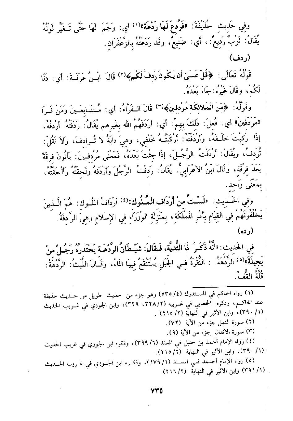 وفي الحديث: (لست من أرداف الملوك) أرداف الملوك: هم الذين يخلفونهم في القيام بأمر المملكة، بمنزلة الوزراء في الإسلام وهي الرادفة.