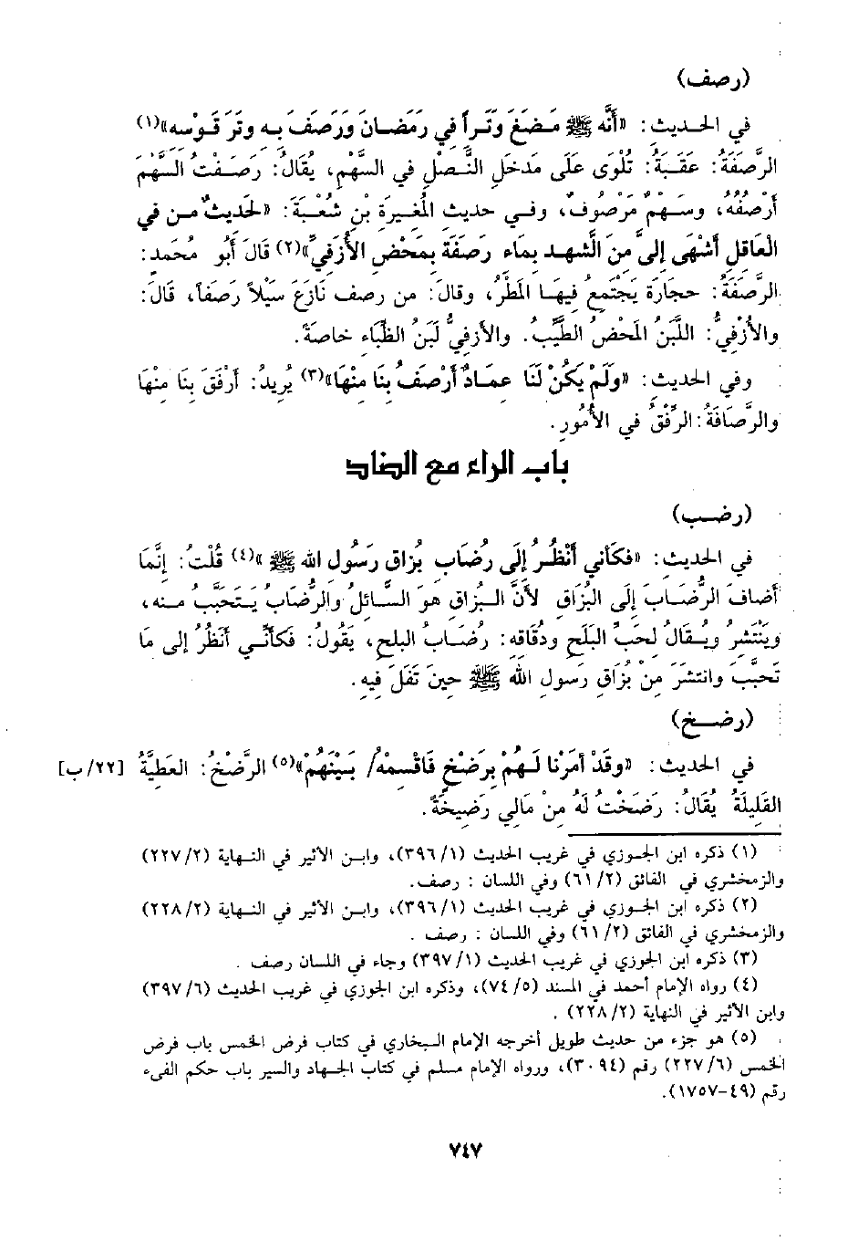 في الحديث: (أنه - صلى الله عليه وسلم - مضغ وترا في رمضان ورصف به وتر قوسه) الرصفة: عقبة: تلوى على مدخل النصل في السهم، يقال: رصفت السهم أرصفه، وسهم مرصوف، وفي حديث المغيرة بن شعبة: (لحديث من في العاقل أشهى إلى من الشهد بماء رصفة بمحض الأزفي) قال أبو محمد: الرصفة: حجارة يجتمع فيها المطر، وقال: من رصف نازع سيلا رصفا، قال: والأزفي: اللبن المخض الطيب. والأزفي لبن الظباء خاصة.