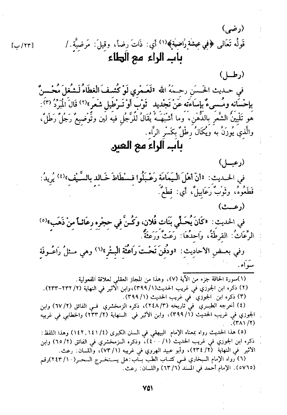 في حديث الحسن رحمه الله: (لعمري لو كشف الغطاء لشغل محسن بإحسانه ومسيء بإساءته عن تجديد ثوب أول ترطيل شعر) قال المبرد: هو تليين الشعر بالدهن، وما أشبهه يقال للرجل فيه لين وتوضيع رجل رطل، والذي يوزن به ويكال رطل بكسر الراء.