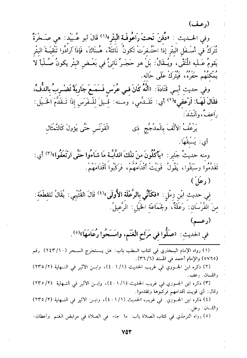 وفي الحديث: (دفن تحت راعوفة البئر) قال أبو عبيد: هي صخرة تترك في أسفل البئر إذا احتقرت تكون ناتئة، هناك، فإذا أرادوا تنقية البئر يقوم عليه المنقى، ويقال: بل هو حجر ناتئ في بعض البئر يكون صلبا لا يمكنهم حفره، فيترك على حاله.