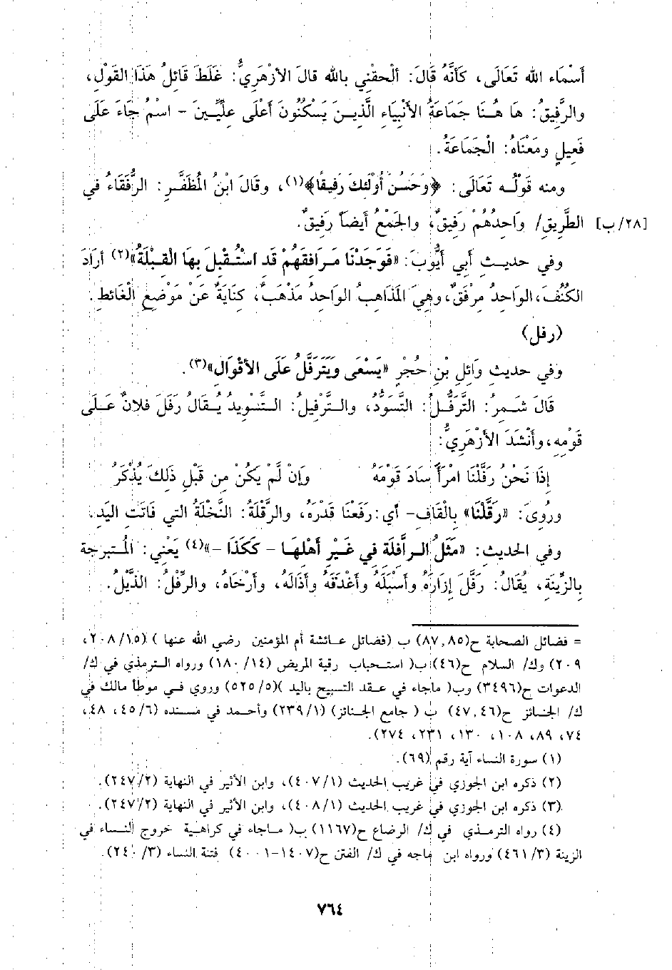 ومنه قوله تعالى: {وَحَسُنَ أُولَئِكَ رَفِيقًا}، وقال ابن المظفر: الرفقاء في الطريق واحدهم رفيق، والجمع أيضا رفيق.