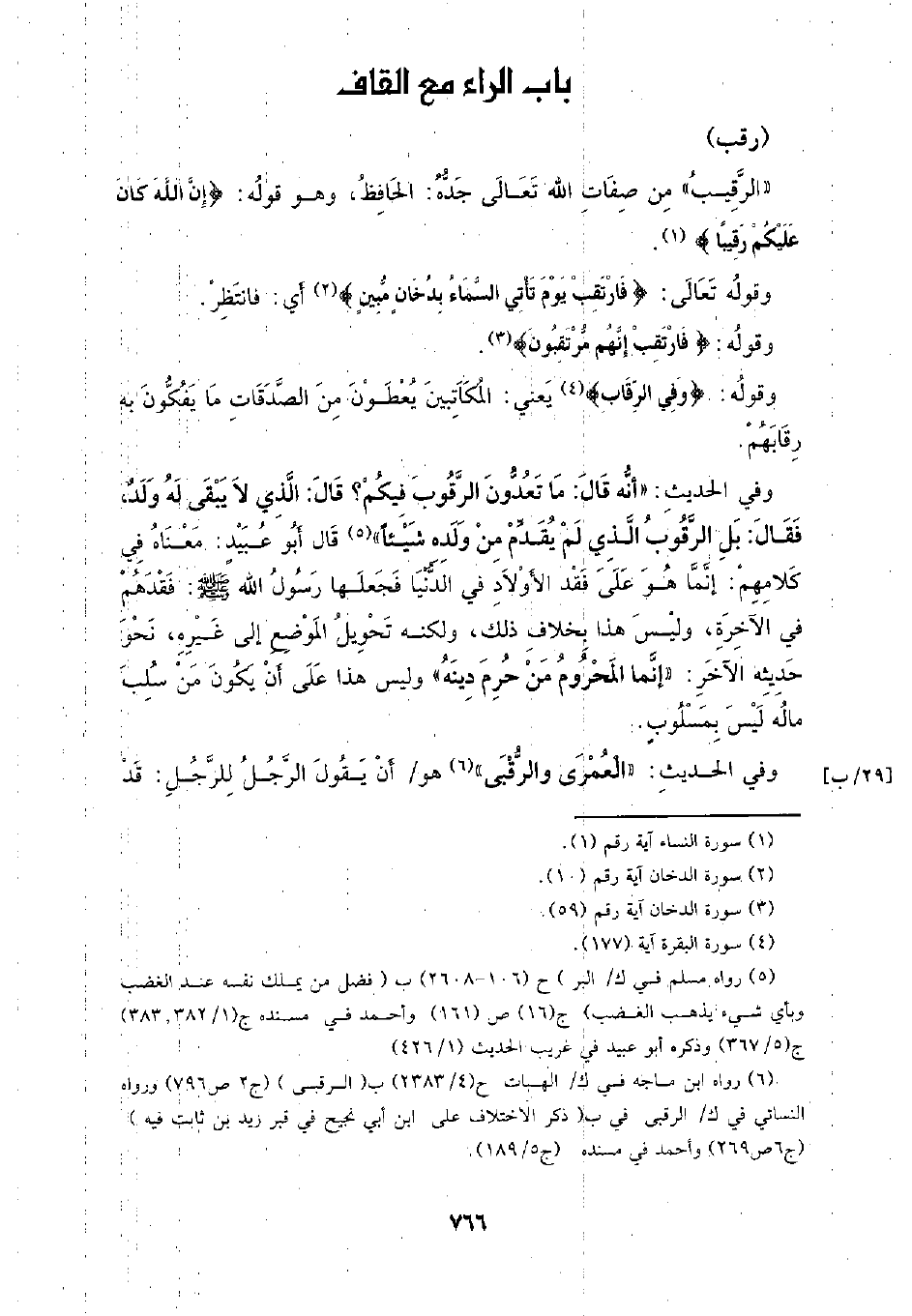 وفي الحديث: (أنه قال: ما تعدون الرقوب فيكم؟ قال: الذي لا يبقى له ولد، فقال: بل الرقوب الذي لم يقدم من ولده شيئا) قال أبو عبيد: معناه في كلامهم: إنما هو على فقد الأولاد في الدنيا فجعلها رسول الله - صلى الله عليه وسلم -: فقدهم في الآخرة، وليس هذا بخلاف ذلك، ولكنه تحويل الموضع إلى غيره، نحو حديثه الآخر: (إنما المحروم من حرم دينه) وليس هذا على أن يكون من سلب ماله ليس بمسلوب.