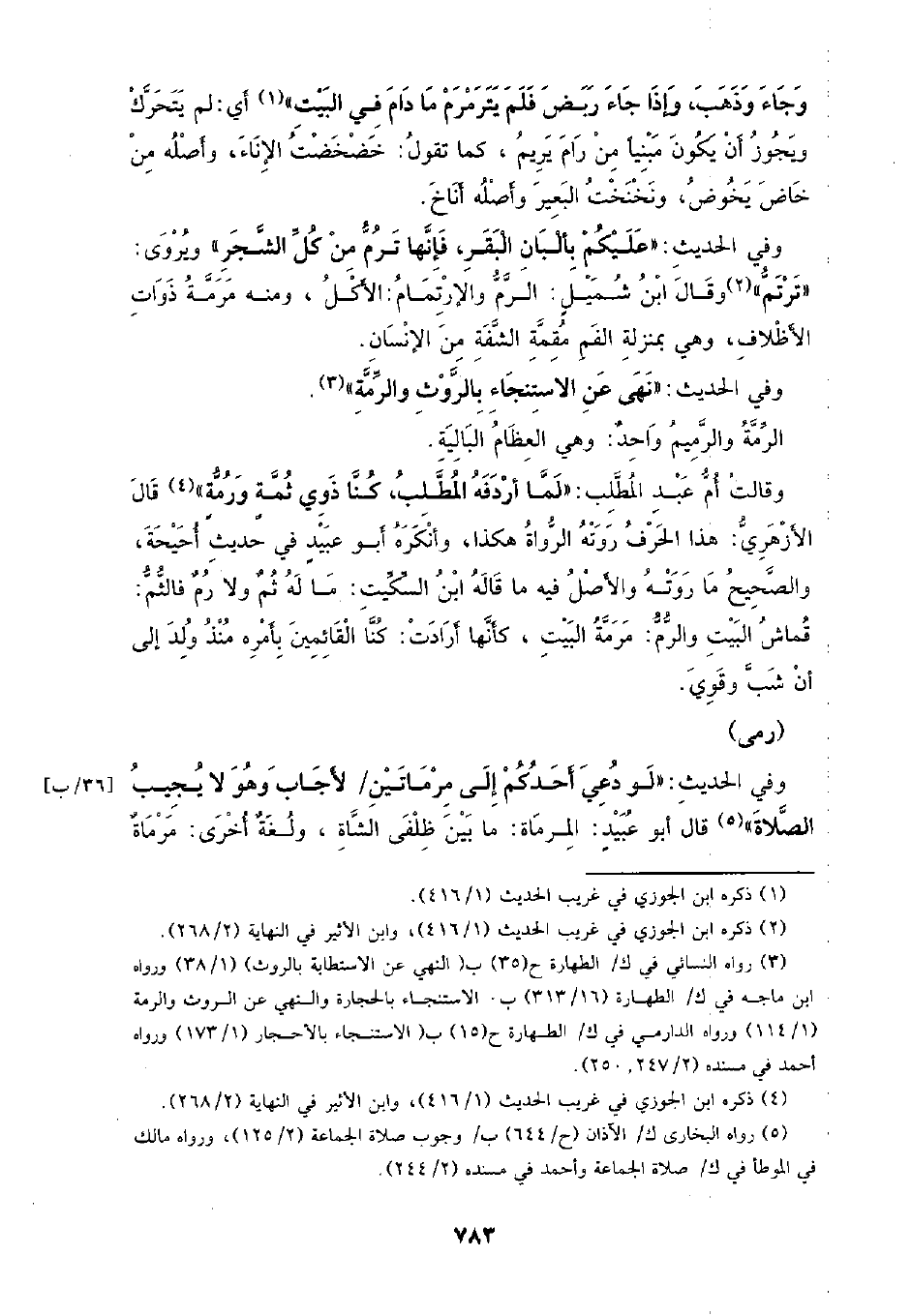 وفي الحديث: (عليكم بالبان البقر، فإنها ترم من كل الشجر) ويروى: (ترتم) وقال ابن شميل: الرم والإرتمام: الأكل، ومنه مرمة ذوات الأظلاف، وهي بمنزلة الفم مقمة الشفة من الإنسان.
