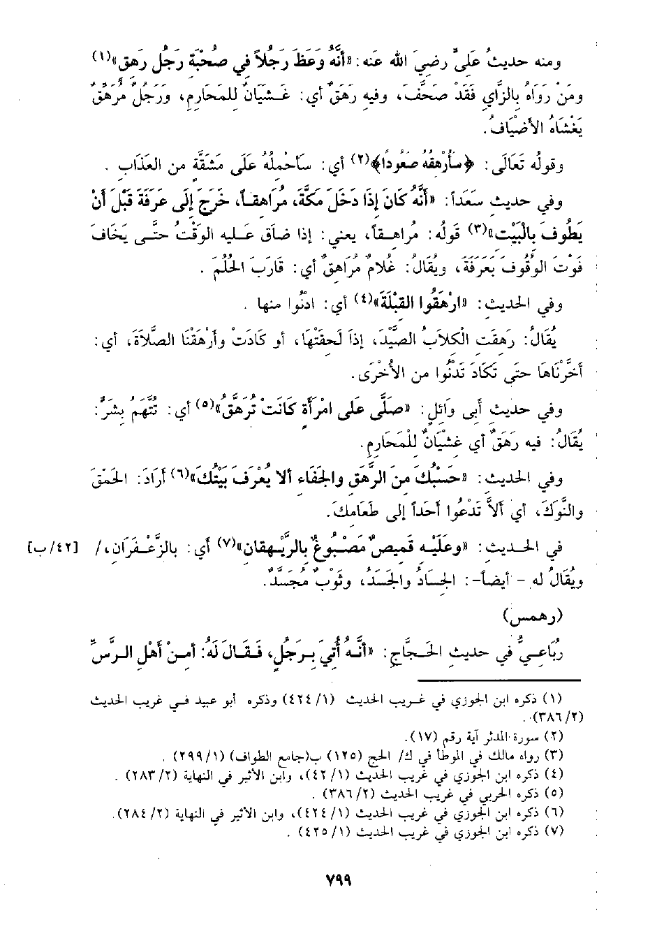 ومنه حديث علي رضي الله عنه: (أنه وعظ رجلا في صحبة رجل رهق) ومن رواه بالزاي فقد صحف، وفيه رهق أي: غشيان للمحارم، ورجل مرهق يغشاه الأضياف.