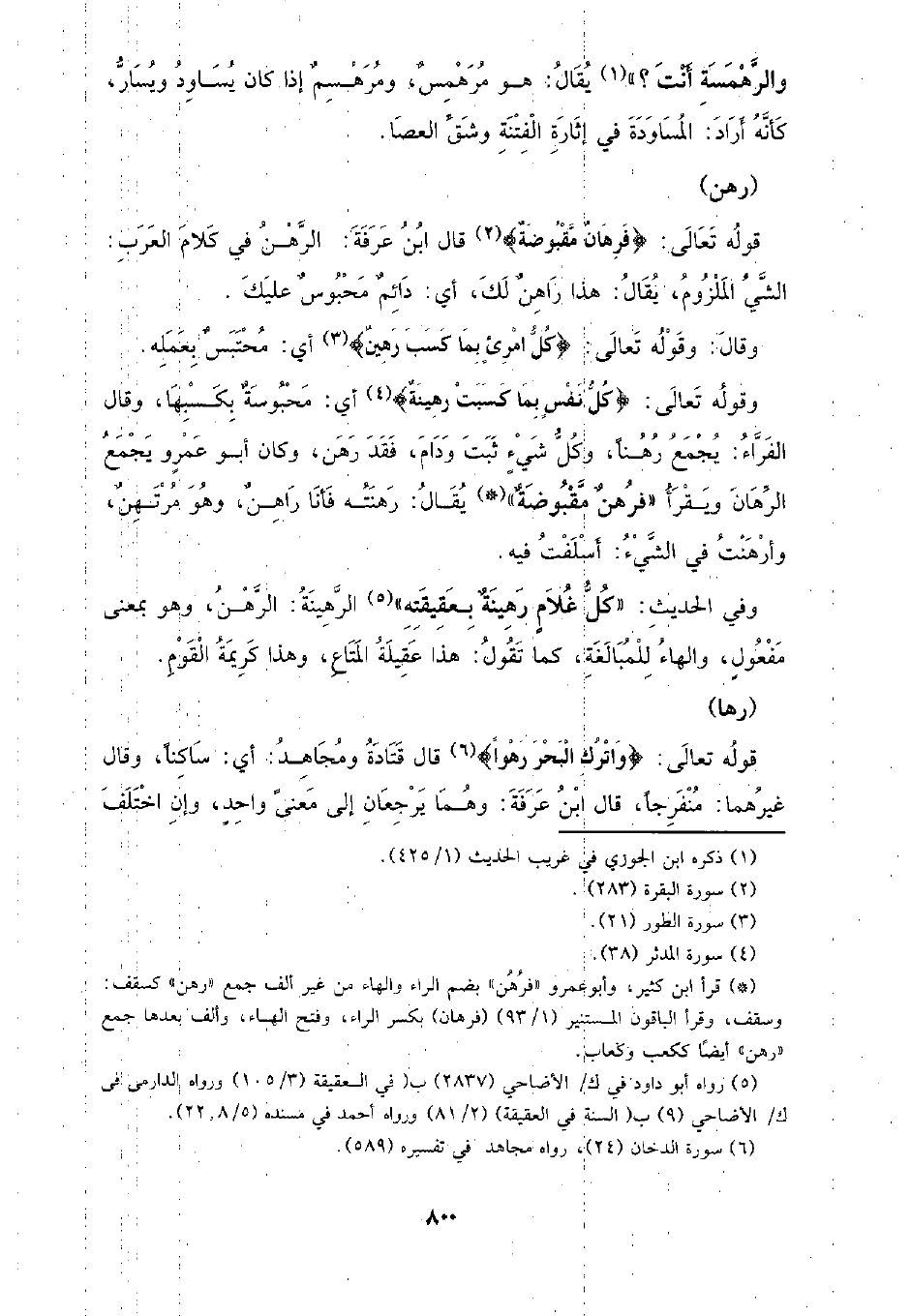 وقوله تعالى: {كُلُّ نَفْسٍ بِمَا كَسَبَتْ رَهِينَةٌ} أي: محبوسة بكسبها، وقال الفراء: يجمع رهنا، وكل شيء ثبت ودام، فقد رهن، وكان أبو عمرو يجمع الرهان ويقرأ} فَرِهَانٌ مَقْبُوضَةٌ} يقال: رهنته فأنا راهن، وهو مرتهن، وأرهنت في الشيء: أسلفت فيه.