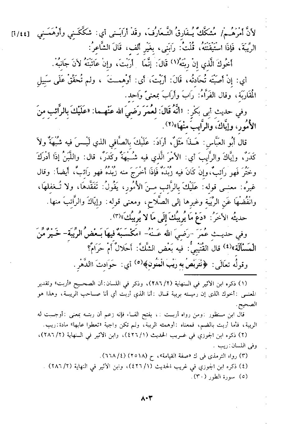 وفي حديث عمر- رضي الله عنه - (مكسبه فيها بعض الريبة - خير من المسألة) قال القتيبي: فيه بعض الشك: أحلال أم حرام؟