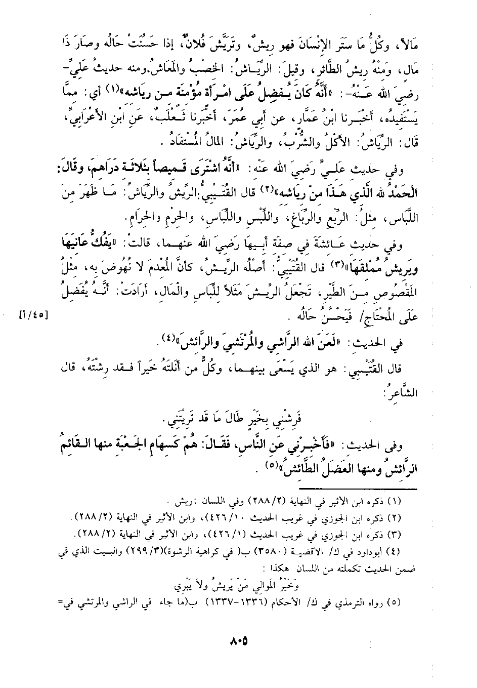 وفي حديث على رضي الله عنه: (أنه اشترى قميصًا بثلاثة دراهم، وقال: الحمد لله الذي هذا من رياشه) قال القتيبي: الريش والرياش: ما ظهر من اللباس، مثل الربع والرباغ، واللبس واللباس، والحرم والحرام.