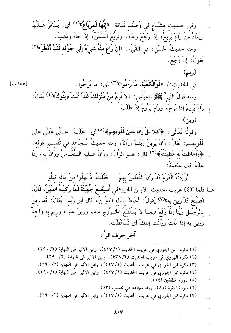 فلما غريب الحديث لابن الجوز (في أسيقع جهينة لما ركبه الدين، قال: أصبح قد رين به) يقول: أحاط بماله الدين، قال أبو زيد: يقال: قد رين بالرجل رينًا إذا وقع فيما لا يستطع الخروج منه، ورين عليه وريم به واحد ورين به إذا مات ورانت إبلك أي تساقطت.