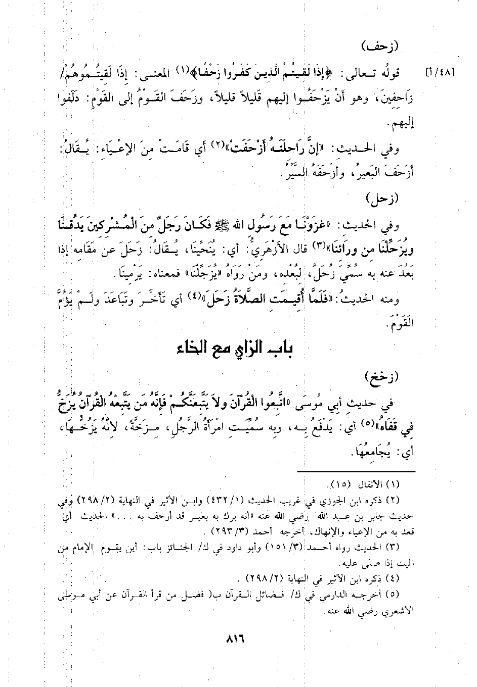 ومنه الحديث: (فلما أقيمت الصلاة زحل) أي تأخر وتباعد ولم يؤم القوم.