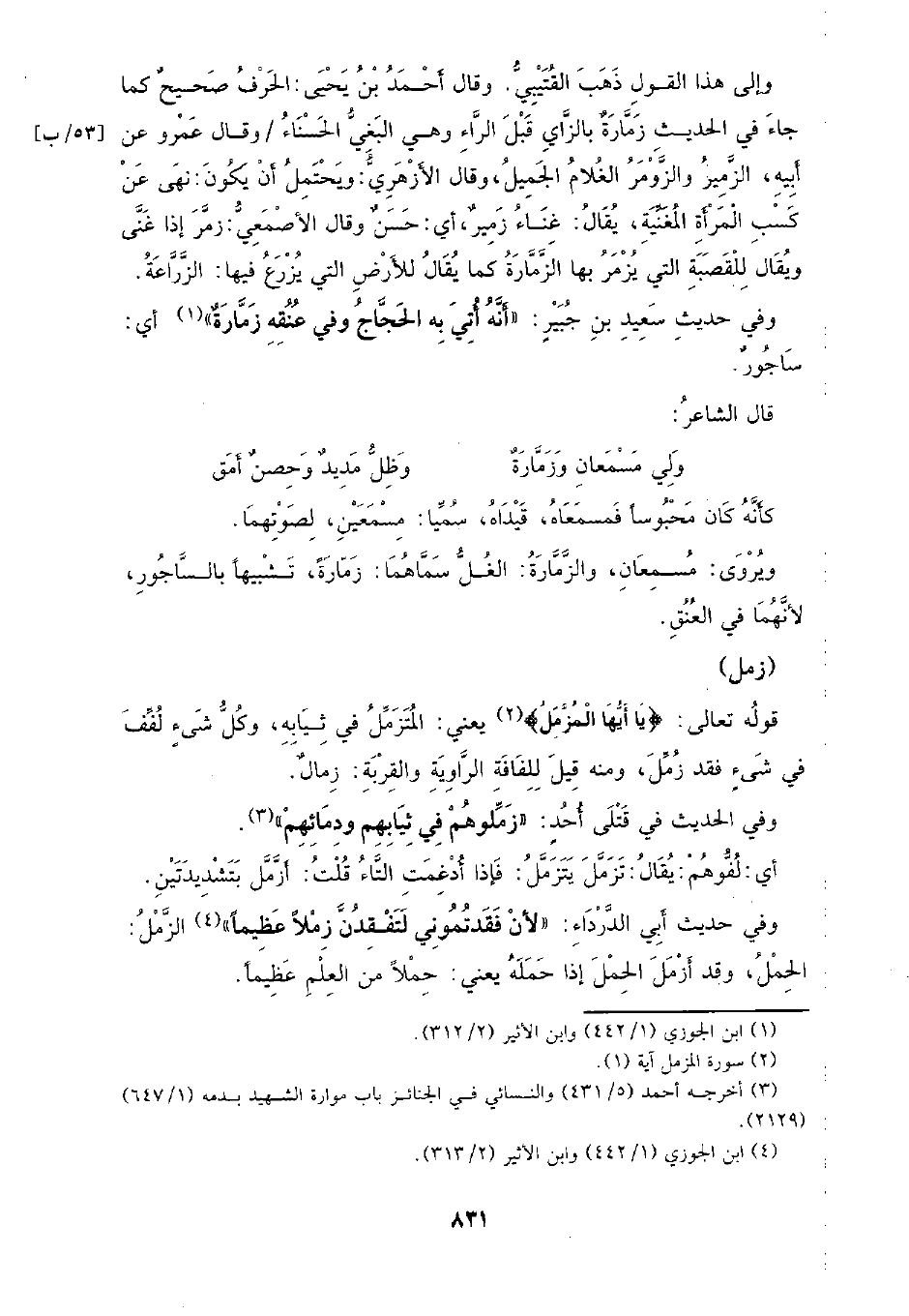 وإلى هذا القول ذهب القتيبي. وقال أحمد بن يحي: الحرف صحيح كما جاء في الحديث زمارة بالزاي قبل الراء وهي البغي الحسناء/ وقال عمرو عن أبيه، الزمير والزومر الغلام الجميل، وقال الأزهري: ويحتمل أن يكون: نهى عن كب المرأة المغنية، يقال: غناء زمير، أي: حسن وقال الأصمعي: زمر إذا غنى ويقال للقصبة التي يزمر بها الزمارة كما يقال للأرض التي يزرع فيها: الزراعة.