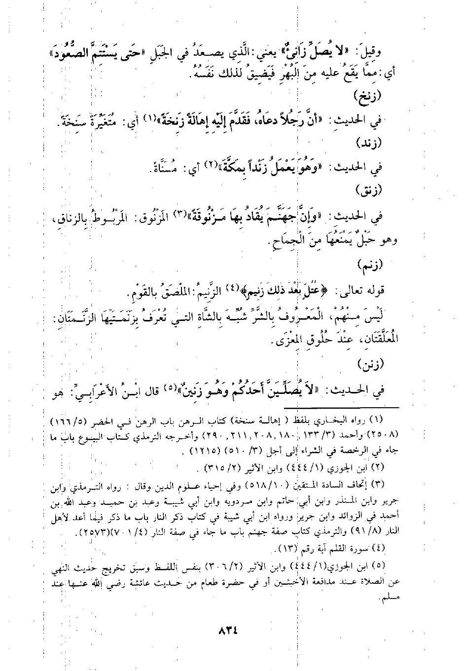 في الحديث: (لا يصلين أحدكم وهو زنين) قال ابن الأعرابي: هو